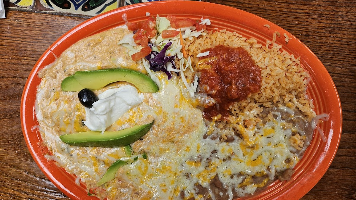 Soft corn tortilla topped with 2 fried eggs and then covered with creamy sauce of jack and cheddar cheeses. Smothered with melted cheeses, and then topped again with sour cream and sliced avocados. Served with Mexican-style rice and beans.