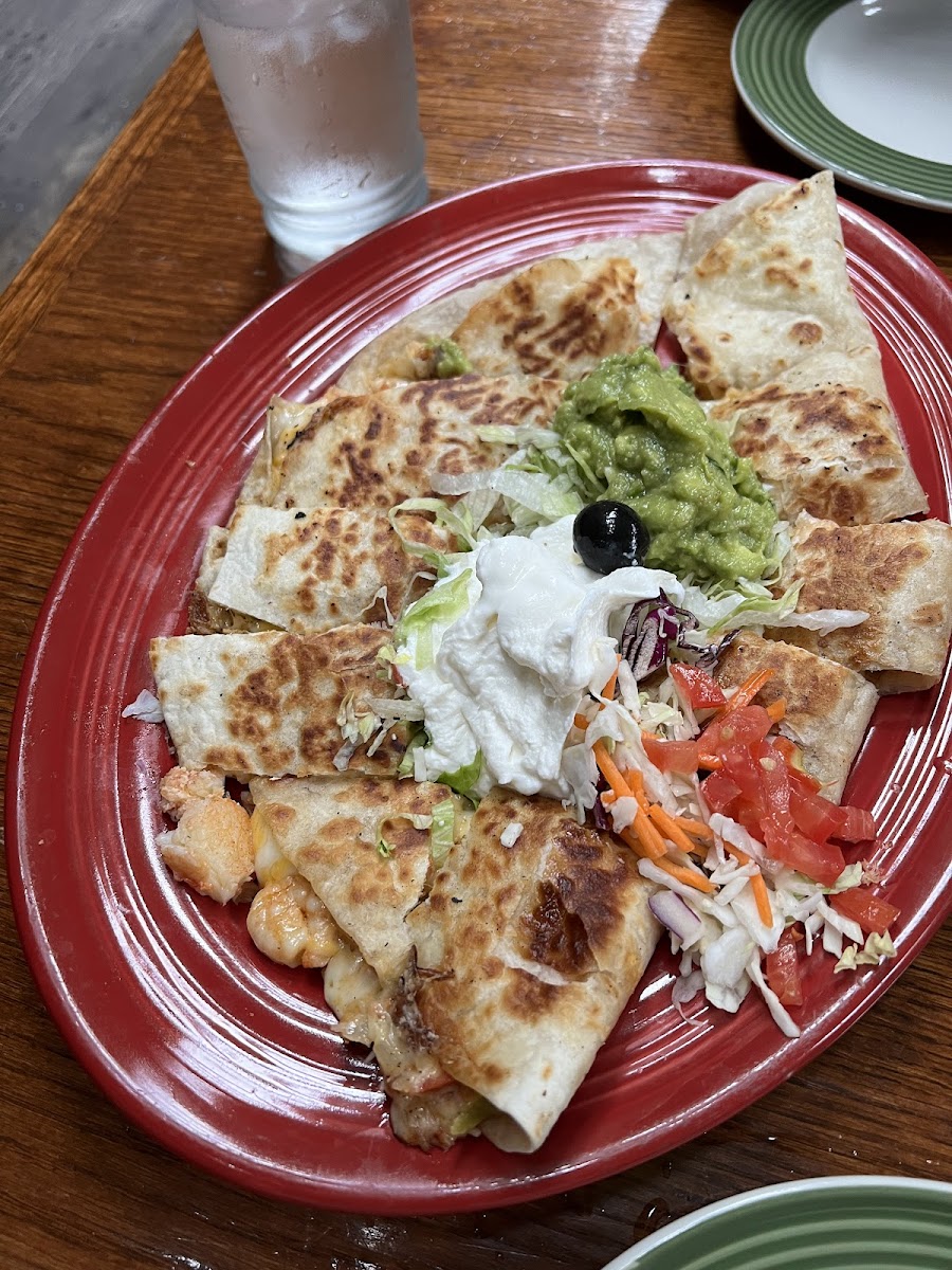 Comes with shrimp, genuine crab, onions, tomatoes, bell peppers and cheeses. Served with sour cream and guacamole.
